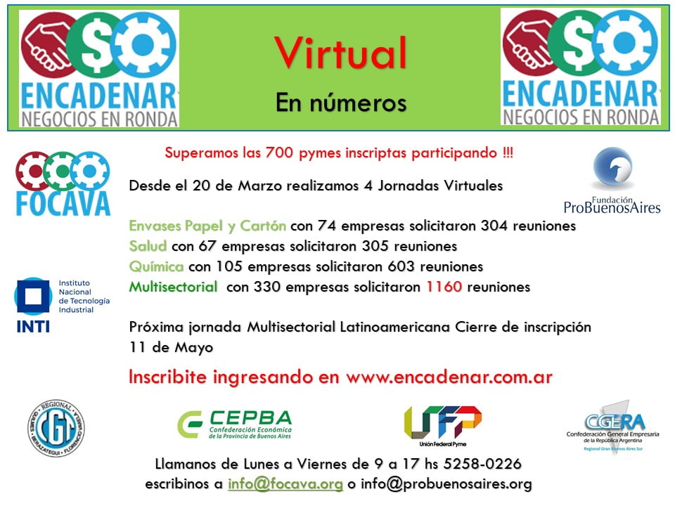 El 24 de Abril cerro la inscripción para participar de Encadenar Multisectorial virtual, en esta nueva etapa decidimos hacer las jornadas de esta manera para ayudar a los pymes a que encuentren relaciones de negocios sin salir de su casa, y ante la difícil situación que estamos atravesando la mayoría de nosotros.