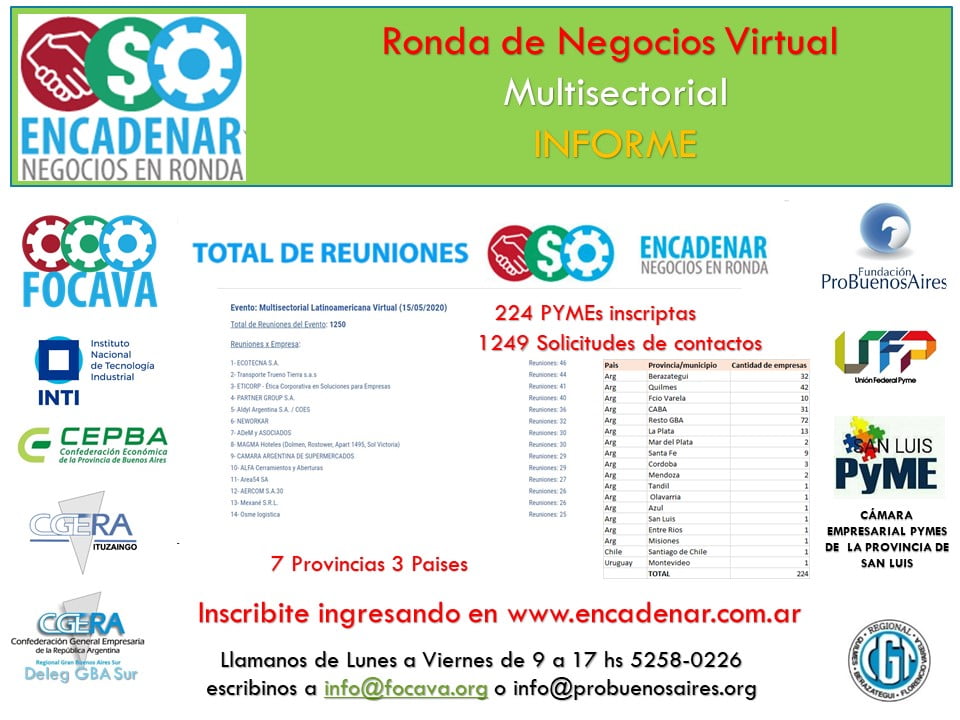 Queremos contarles brevemente cual es el resumen de las primeras cuatro jornadas virtuales y que el 11 de Mayo cierra la inscripción para participar de la Multisectorial latinoamericana, con el mismo objetivo que las 4 anteriores, que cada participante consiga los contactos de las empresas que eligió y lo eligieron